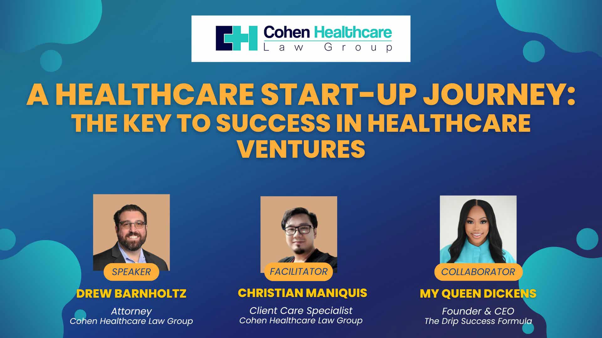 Good afternoon, everyone. Thank you for attending our second installment for our webinar series, and the title for today’s webinar would be a Healthcare Startup Journey: The Key to Success in Healthcare Ventures. Today, we’ll be mostly following up on the discussions that we did on the last webinar that we had with attorney Drew Barnholtz and Holly Little. Mostly we’re going to be diving on those frequently asked questions related to the documents and the other nuances that was previously left undiscussed on the previous webinar.