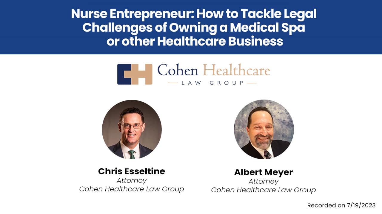 Hello everyone. We are so excited to welcome hundreds of registrants that were invited to this webinar by our collaborating team NursePreneurs. Welcome to our webinar community. Big thanks to Catie Harris and Casey McGovern for making this thing possible. And of course to our regulars, clients and friends, once again, welcome to another Cohen Healthcare Law Group webinar. We hope that this webinar would give value to you and to your venture. My name is Dana Porcalla, I am the marketing director of Cohen Healthcare Law Group. We also have your IT director, Oki Tjandrakusuma and our senior care team member Christian Maniquis. This webinar is the second part of the three part webinar series focusing on nursing businesses, IV clinics, medspa and other healthcare ventures for non-physicians. The title is Nurse Entrepreneur, how to Tackle Legal Challenges of Owning a Medical Spa or Other Healthcare Business.