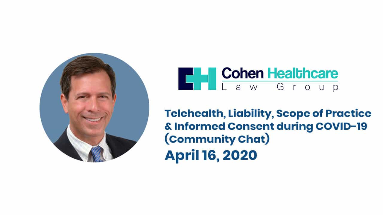 Informed consent, I mean definitely the informed consent should cover Telehealth, telebenefits and risks. And that’s something that we could help you work on if you’re not comfortable wrapping in language. But I think the main point is that informed consent has to do with risks, benefits, and alternatives. And we covered that a little bit again in one of the previous webinars.